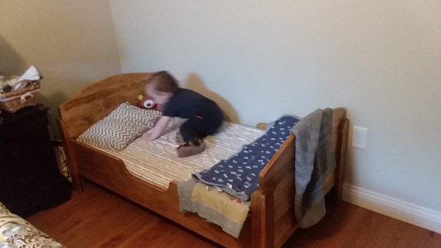 Last week, the FIL and I came up with plans to build a toddler bed for Little Man. We have been co-sleeping, and since getting up here, he’s been with me, and Squatch has been in the next room, due to the smaller beds (we were in a King). With the holidays coming up, and expecting guests, I wanted to get Little Man sleeping on his own, because three of us in a bed is quite tight. I found a bed I loved on Amazon, but it was almost $200! I could not bring myself to spend that much on a bed, so I asked the FIL if he thought we could make it, and he said we absolutely could! Squatch went out and helped in the pole barn, and we brought the finished product in yesterday afternoon. Little Man was so excited; he climbed in, and walked around clapping. Getting him to sleep in it was whole different story. I got him to sleep, and put him in the bed; he immediately got up on all fours, screaming. I grab him, get him back out, and put him down – sitting up and screaming. So, I crawled in next to him (the bed successfully held us both!), got him settled back down and sleeping, and crawled out. He was instantly awake (what is it with kids? He’s passed out completely and then the minute I roll away, he’s wide awake? Really?), so I grabbed him, got him back down, and just brought him into bed with me. I know it’s not going to happen overnight where he will sleep solo, but I don’t think I was expecting him to wake so easily!