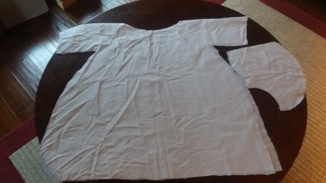 I started working on Little Man’s Hallowe’en costume last night. I know, I know, I’ve got that baby blanket still in the works, and I’m going to pick it up once I’m done here. I’m making Little Man into a ghost for Hallowe’en. I found two different costumes on Pinterest I really like, and am combining them to make this one. I priced out fabric at WalMart a few weeks ago, and they had a sale on their twin size white fitted sheets. So, for $1, I’m making this costume! I spent about an hour last night, ripping the seams on the edges, and pulling out all of the elastic; we will find something to do with it in the future. This morning, I did a rough cut to make the shape of the gown and the hood. I’m thinking Thursday I’ll pull out the sewing machine and stitch it all together. It is a bit big, but will work for when we go to the trunk or treats, and I’ve got him in a big coat.