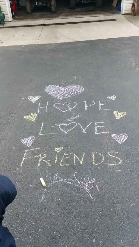 I also believe that more people will continue to spend quality time outside. When we were in the suburbs, I already saw this. All day, there were people out walking; walking dogs, parents walking while their little ones rode a bike, pulling kids in wagons or pushing them in strollers; they were enjoying their time together and being out in nature. Here at the lake, just due to where we are, people are always out walking, and I’ve seen some new neighbours out and about, as well as old one. On FaceBook, friends have posted how they are putting bears in their windows, for local children to find as they go on walks. The lake has our own version of this: we are decorating hearts and putting them in windows that can be seen from the road. Little Man and I did our part after our post-lunch ride, and drew with chalk on the driveway; we found a few hearts in windows on our walk and ride earlier.