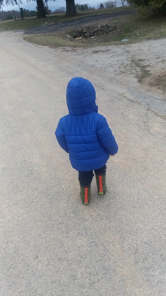 When we woke up this morning, there was sun streaming through the blinds. It was not rainy or cloudy! We took advantage of this, and after we had a yummy breakfast of leftover pancakes and some applesauce, and Mummy got her big mug of tea, we got all dressed and headed out on a walk. Little Man learned about his right pocket this morning; his mind was blown that he has TWO different pockets in his coat to use. Yes, the rock came with us on the walk; it spent a lot of time in his pockets and out, adventuring as we went along.