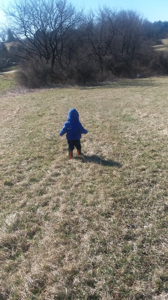 Little Man did most of the walking today; he did want “Up” on my back, and I’m so glad I chose to wear my Ergo today, just in case he didn’t want to walk the entire time. He is so heavy though, but today it was much easier than the previous time I walked wearing him; I know the next time it will be easier as well! We walked across my brother’s lot to the next street, and up to the other trail access, and then Little Man wanted down. He ran across the field, exploring, and then stopped to pick up as many rocks as he could find when we were on the actual trail. He would bring me a few rocks and I would place them in the pocket of my hoodie, tossing them off to the side when he wasn’t looking. I knew he would not remember all the rocks he had given me. We saw our doggy friends from afar; they were coming up from the little/dog beach with their owners and branched off before we got there.