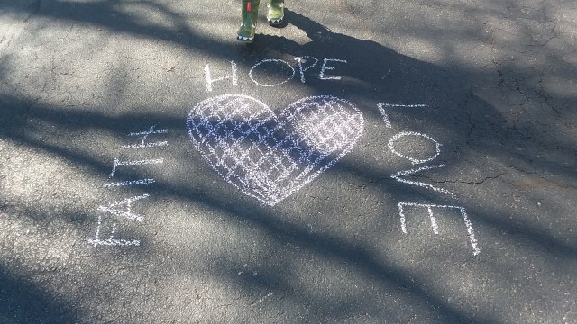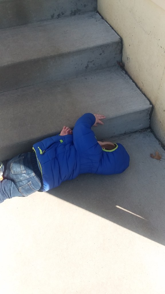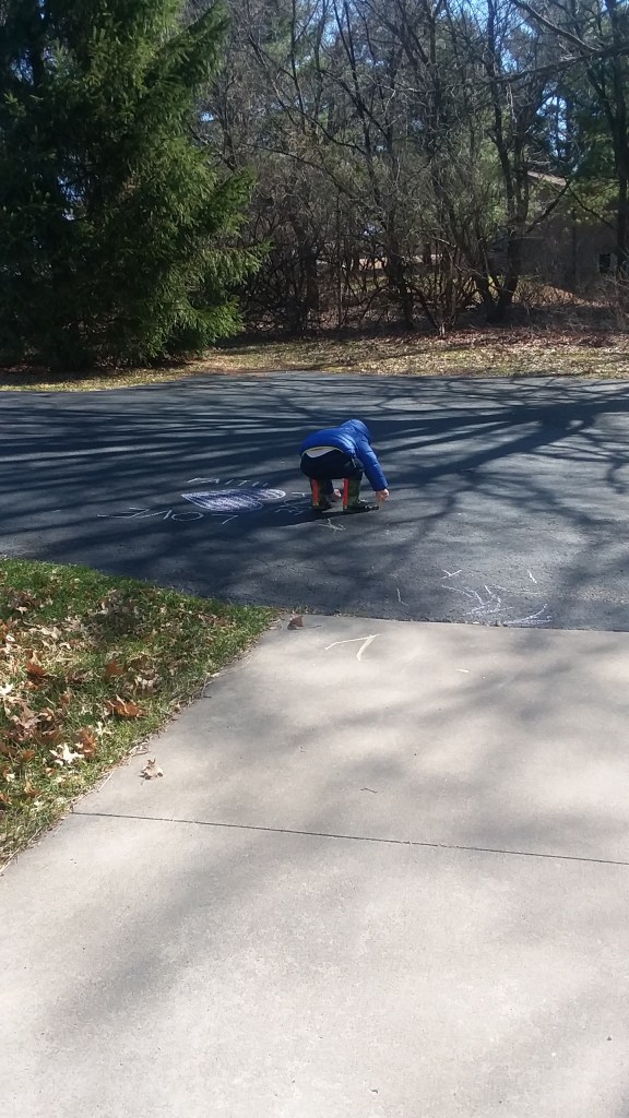 We spent an hour and a half just wandering the neighbourhood, trails, and the backyard. We even snuck in some time to draw some chalk messages on the driveway again, because the rain washed off our messages from last week. Back at the house, Little Man walked the perimeter of the yard, wanting to go adventure in the ravine/gully that leads to the water. He kept looking back at me, trying to inch closer, and I kept saying “No.” If I had some good muck or hiking boots, I would have thrown him on my back and walked him down, but I’m not going down there in gym shoes after having showers all weekend.