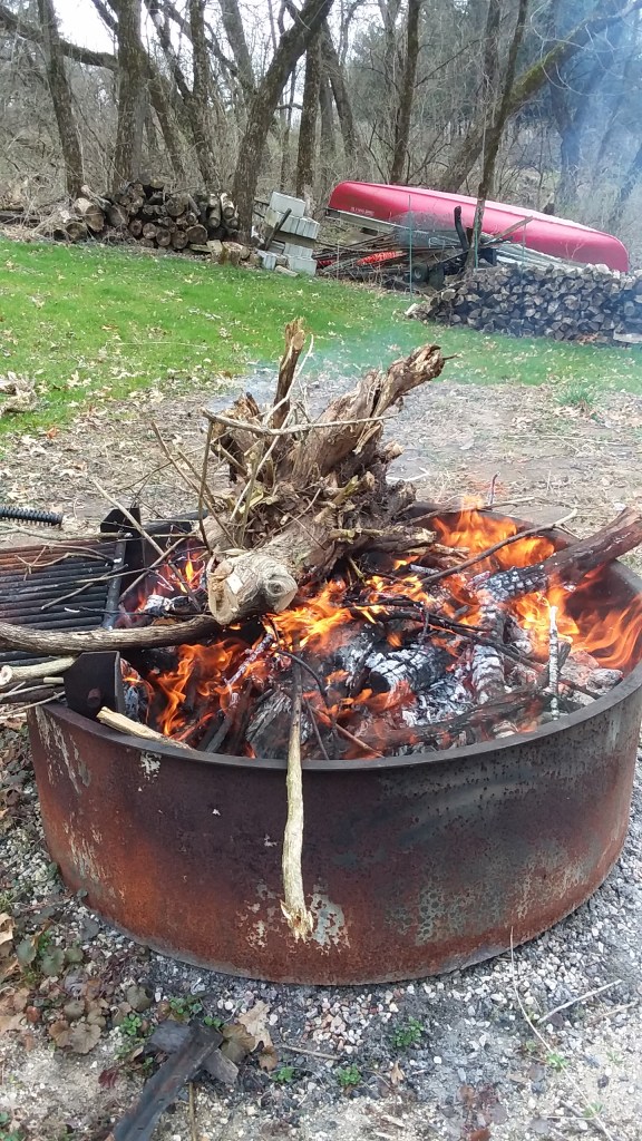 About this time, my dad came out and grabbed the chainsaw, and proceeded to make quick work of the remaining bushes. I stayed down at the fire for another hour and a half, cutting everything up smaller, adding them to the fire, stirring everything around once in a while. I love the smell of a wood burning fire, and yesterday was no exception. The downside is that I had taken a nice long shower in the morning, before I took a quick run into town, so I smelled like fire the rest of the day, as I did not want to take a second shower. So, I went to bed smelling like burning wood. Oh well; it was worth it.