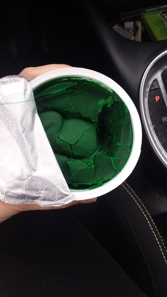 Now, at this point, I was starting to panic. What was I going to do? My green frosting was a hot mess and my homemade stuff just wasn’t going to work without sugar. I grabbed the nasty can, my wallet, and Squatch’s keys, and I went to WalMart. First stop: Service Desk. The lady there agreed with me that what some asshat had done was just disgusting, and she told me to go grab another can and bring it to her, in exchange for the one I had brought in (I checked the thing twice, and had the service desk lady do an additional check). I also went and picked up two bags of powdered sugar. When I got back home, I finished whipped the frosting together, using both green AND blue colouring to make it (the green on its own was just too olive-y looking for me). Then I loaded the top of the cake with some fudgy frosting, did the sides with the green, and sprinkled crushed up oreos on top.