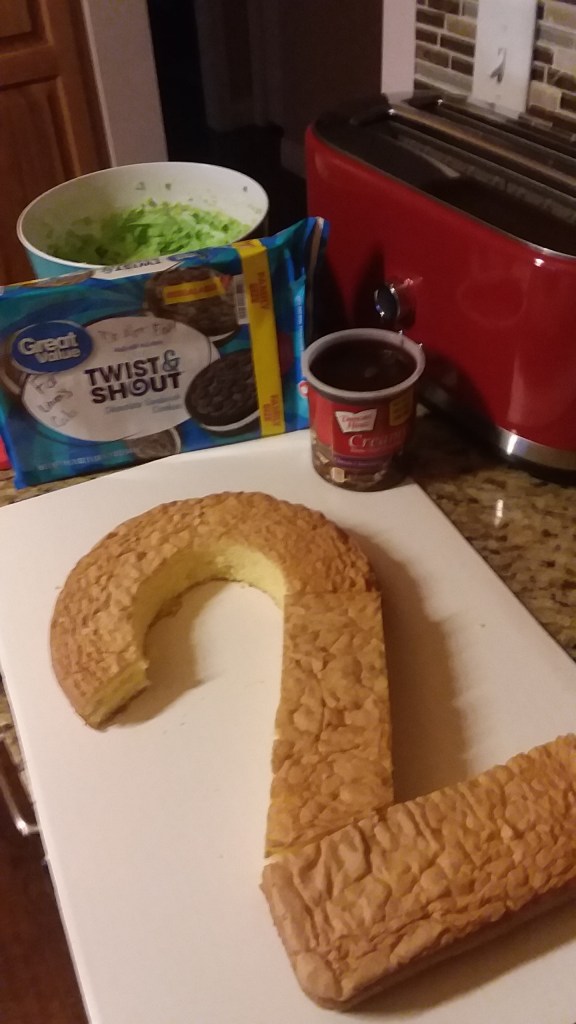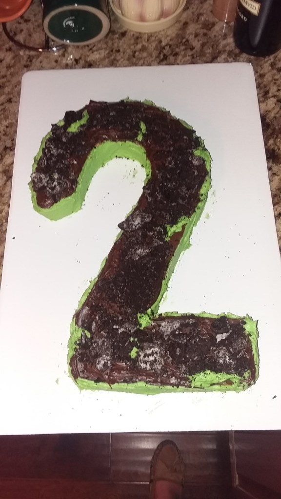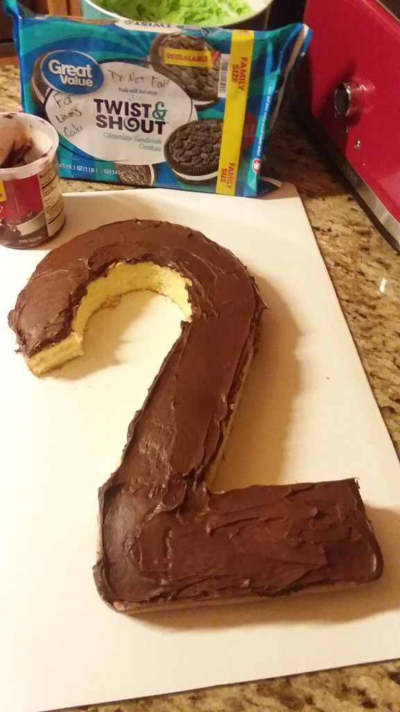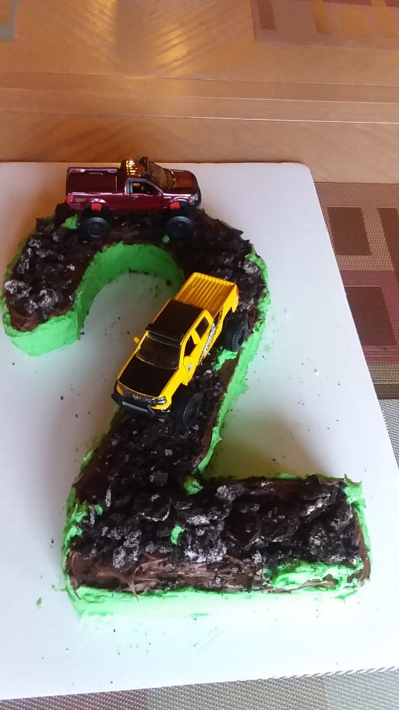 I made the cake (1 round pan and 1 square pan), and cut it into a number 2. I had picked up a can of green Wilton’s frosting last weekend, and figured I would try it out on the sides of the cake; since I had planned on doing a dirt top of the cake for the trucks to sit on. Well, I pull the lid off the can, and see that the foil has been peeled back. When I look into the can, there is a big fingerprint dug down into the frosting, and it looks all dried, cracked and gross. I thought someone in the house had messed with me, but they all actively denied doing anything to the frosting. It was time for Plan B. I pulled out 2 sticks of butter and threw them in the microwave to soften while I grabbed cream, vanilla, powdered sugar, and food colouring. I get my homemade buttercream going, and run out of sugar. I look through the baking cabinet and pantry…no sugar. I ask MIL if there is any sugar I’m missing, and she looks…no sugar.