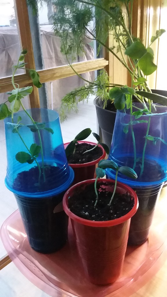 The garden is looking great. I transplanted the Sugar Snap Peas and Ashley Cucumbers on Friday morning. Thy are now in some large cups. I unfortunately didn’t have any skewers or anything to help them trellis on, so for now, I cut the bottom off of two other cups and have them on top to give them some assistance.