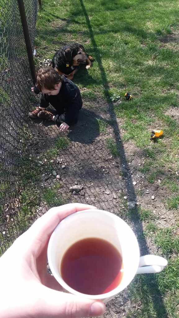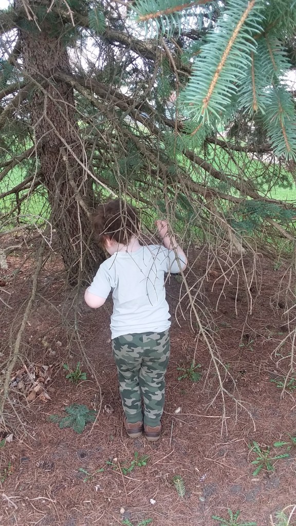 The weather was gorgeous, so we spent a lot of time outside. His favourite place is to play next to the fence. He brings his trucks over, and he digs and plays. Little Man also likes to adventure under Nanny & Papa’s pine trees out front.