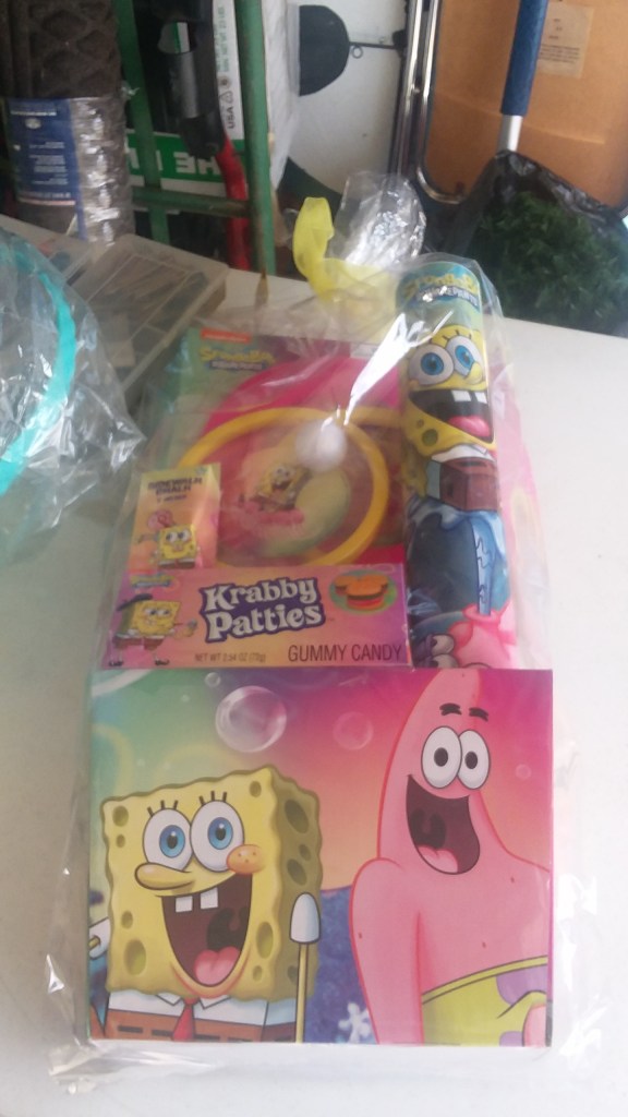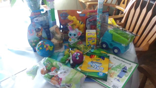 Alright – the Aldis baskets were indeed shit. It was cheap crap and candy, so much candy. Plus, Little Man has no idea what a Spongebob is, so just a waste. The blue baskest from MIL – Oh. My. God. Toys, candy, colouring books, markers, chalk, more candy, more toys. What the hell was she thinking? I opened it, and Little Man was just overwhelmed with it all, and was more intrigued by his cousins as they opened their baskets. I decided to take his two baskets and the candy and pop them right in the SUV. Out of sight, out of mind.