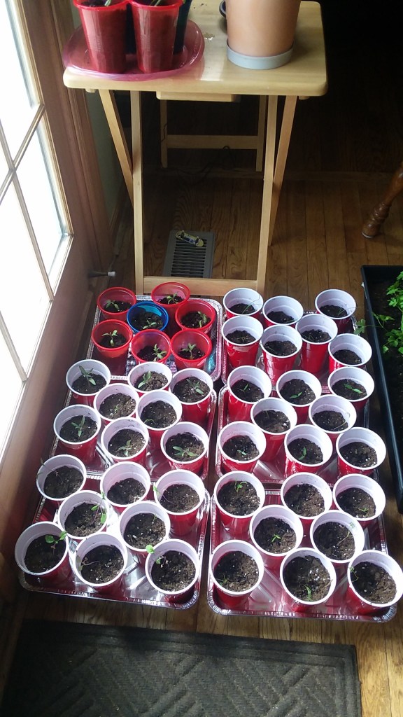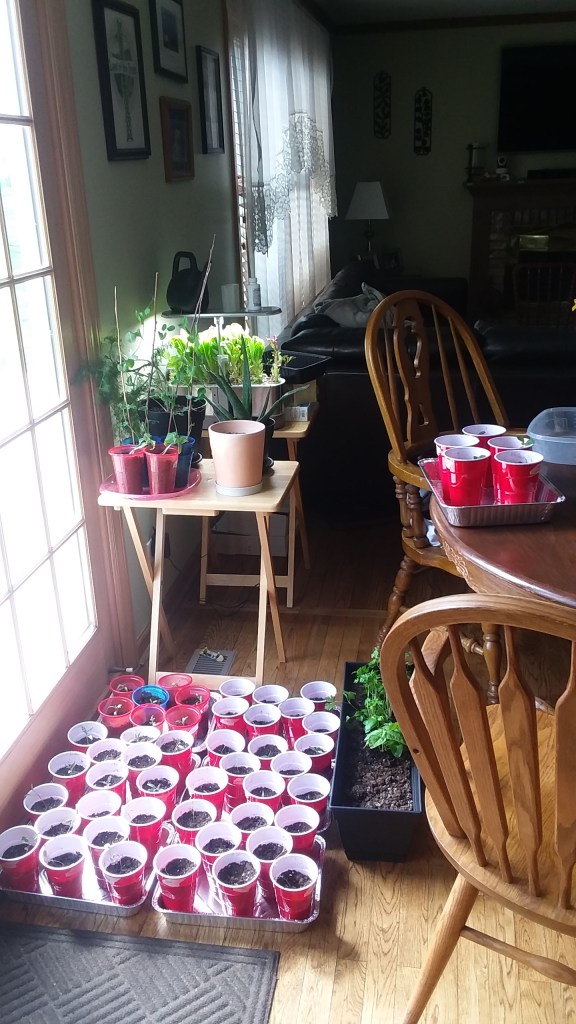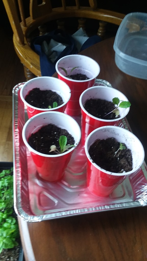 I haven’t made any progress with the garden at the lake. I did get most of my veg transplanted into larger containers this week. I’ve a few mustard plants to go, celery as well. They were just too small to move. I’ll give them another week or so to grow before putting in the solo cups. But, these little plants are taking over the kitchen!
