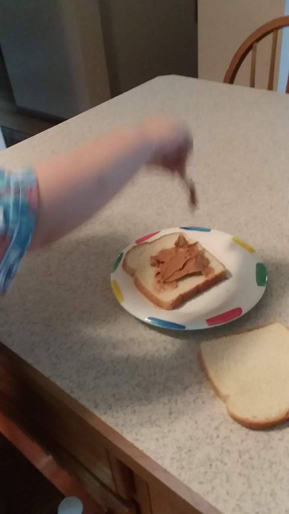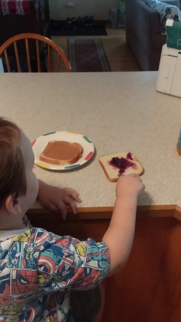 Little Man has become quite independent lately. He insists on going poop and pee by himself (only those 2 together, he still wants me in there just for pee), calling me when he is done. It’s nice to see the understanding happen as he runs to the bathroom, “Mummy, me need you!” or “Mummy, me do it myself,” he will say. Our latest adventure is him making his PBJ by himself. I’ll put a hunk of peanut butter on one slice of bread, jam on the other, and he will use his “Baby knife” to spread it around. Every few swipes, he will lick the knife and go “Mmmmm…” then go back to spreading it. I do the majority of the cutting, but he gets to cut the very corner spots.