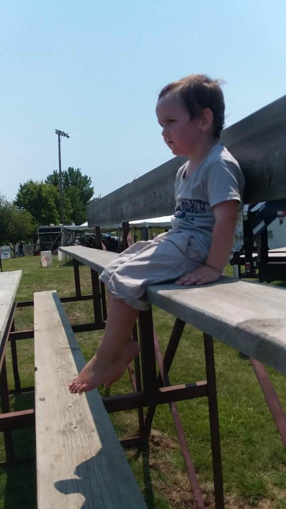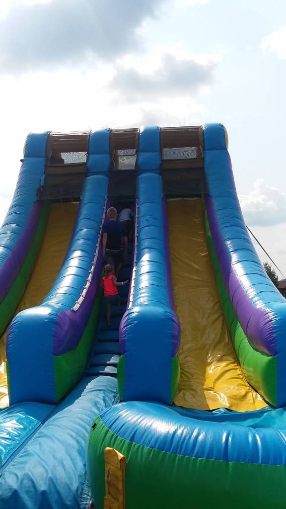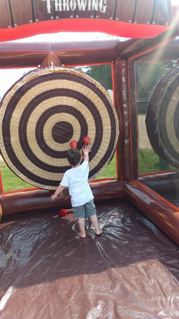 This past weekend was the local Community Fair. It was so much fun. My mother had her food trailer set up; there were not a lot of food options, just her, a cheese curd guy, and then the burgers being sold in the Community Building, so she did quite well. I’ve almost got her decided on only doing these events, instead of monkey-dinking around, making pennies selling breakfast at the lake. But, the fair had a great kids area – it was all inflatables! Little Man LOVED it. Friday night he wanted to make sure I was right there with him, waiting outside the two smaller bounce houses, but Saturday and Sunday, he had his courage and was running from bounce house to bounce house. He even took the chance to venture to the big slide! It was hilarious to watch, as he was so slow, so there was always a big line of kids climbing up behind him, but then he would hop over to the slide he wanted, bounce a few times, and then jump and slide down. There was also an inflatable Axe Throwing station, which he started to get the hang of by Sunday.