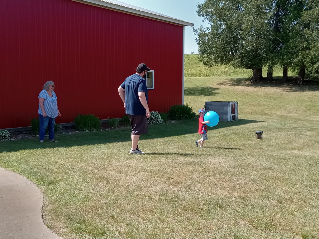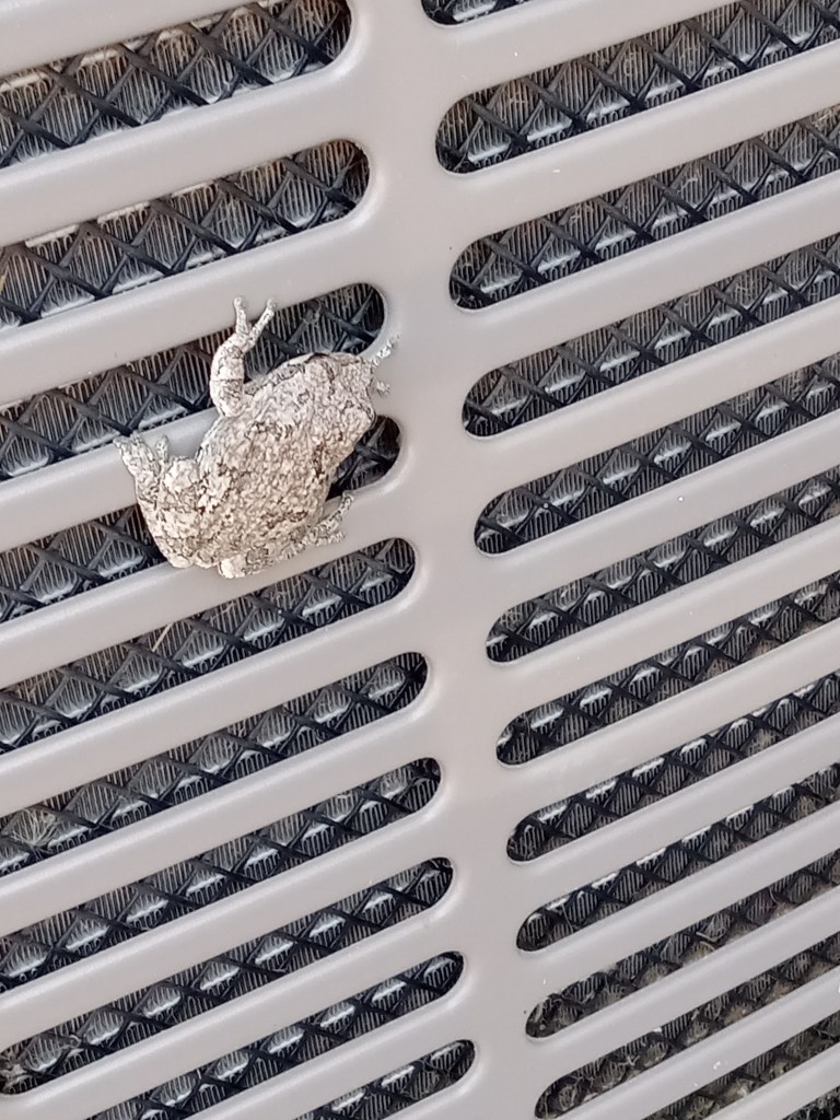 We spent Saturday afternoon at the inlaws’ place. They had FIL’s family over on Friday night, and had invited Little Man and me…but we chose to skip it and not go without Squatch. So, we headed over around noon and had some delicious ribs and pork tips. After we ate, we were sitting on the patio…Little Man, Squatch, and Granma were out in the yard throwing a ball back and forth for a bit. I went to separate two of the stacking chairs, and not one, but 2 frogs jumped out! MIL freaked out, Squatch and I laughed, Little Man wasn’t quite sure what to make of it all, due to the polar opposite reactions of the adults in the area. It looked like a Daddy frog and Baby frog…Daddy jumped onto the air conditioning unit while Baby jumped to the ground and was hanging out next to the garage. They were so dang cute!