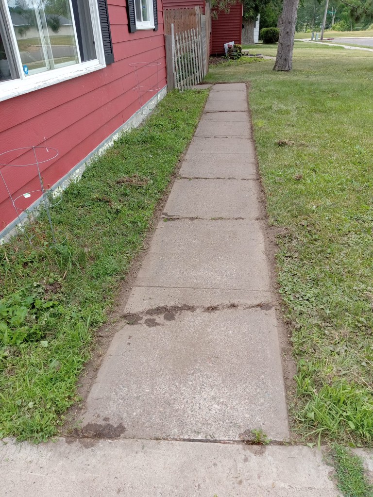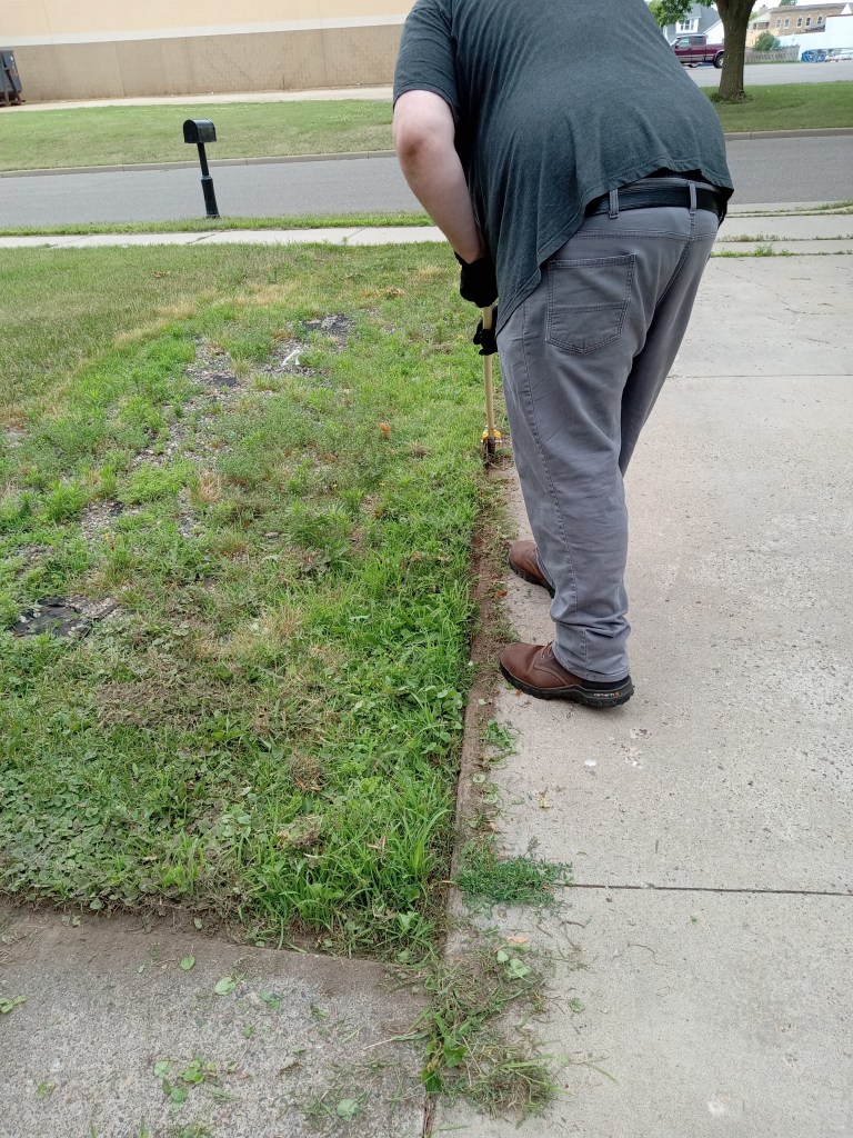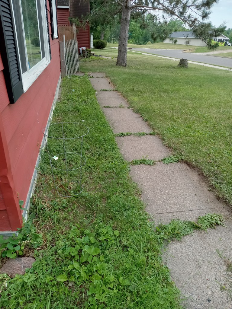 Sunday we did yard work. Squatch hung up my clothesline – I picked up a retractable one and we have it set up so I just have to back up the Dreadnaught a bit then bring the cord across the carport. He also threw some seed in the area of the backyard we’re trying to get grass back growing in after we pulled up the landscape fabric and woodchips that had been all over half the dang yard. Squatch then got to use his newest tool: a manual edger! It took a lot of work to do, but the driveway, sidewalk, and front walk are now cleanly edged. The before and after is so awesome. While he was edging, I went to the backyard and watered the new grass seed and my garlic…I have garlic scapes AND two Egyptian Walking Onions have FINALLY popped up! Yippee!!!