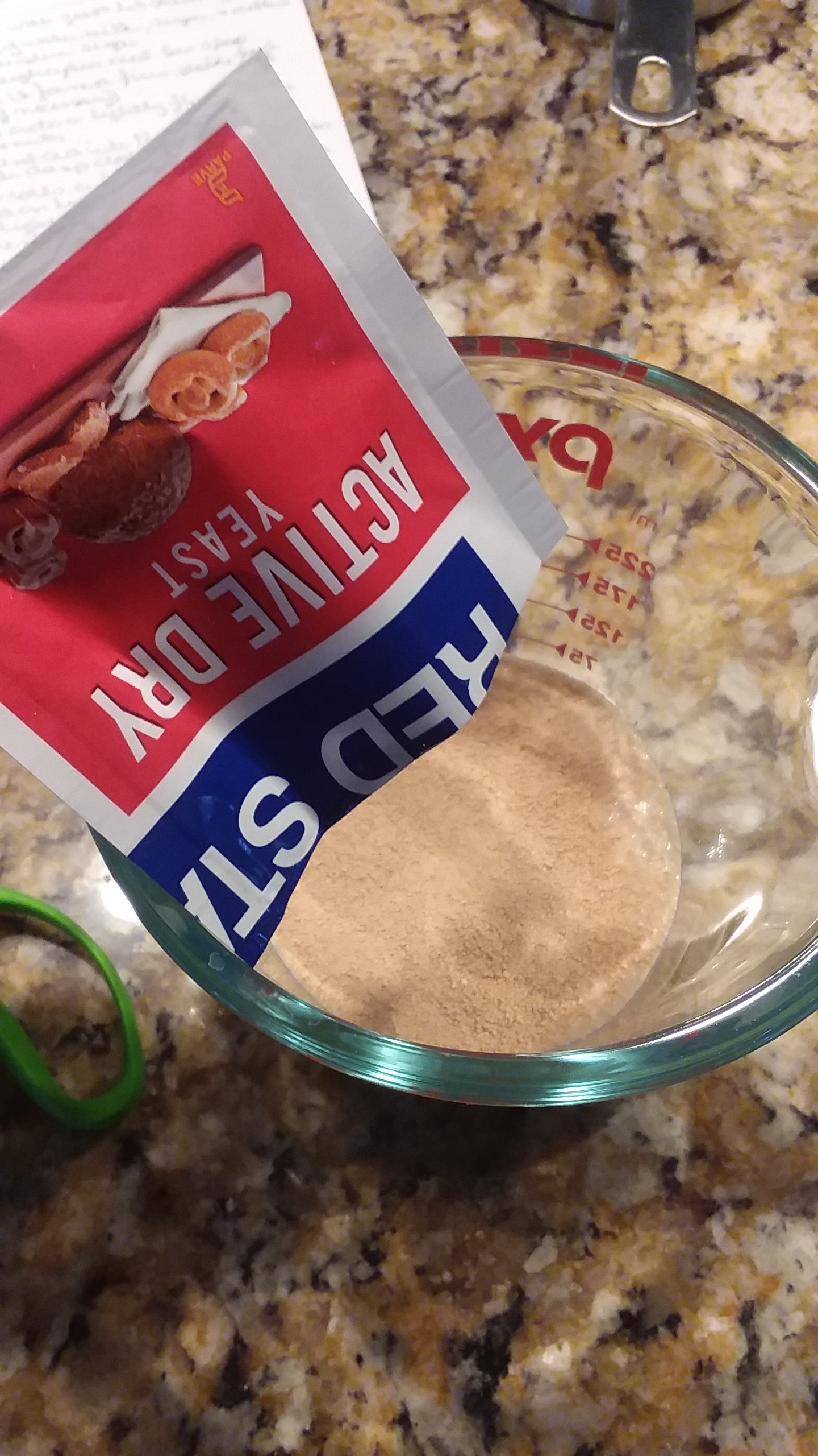 - Mix 1/3 cup warm water with yeast and let stand until foamy