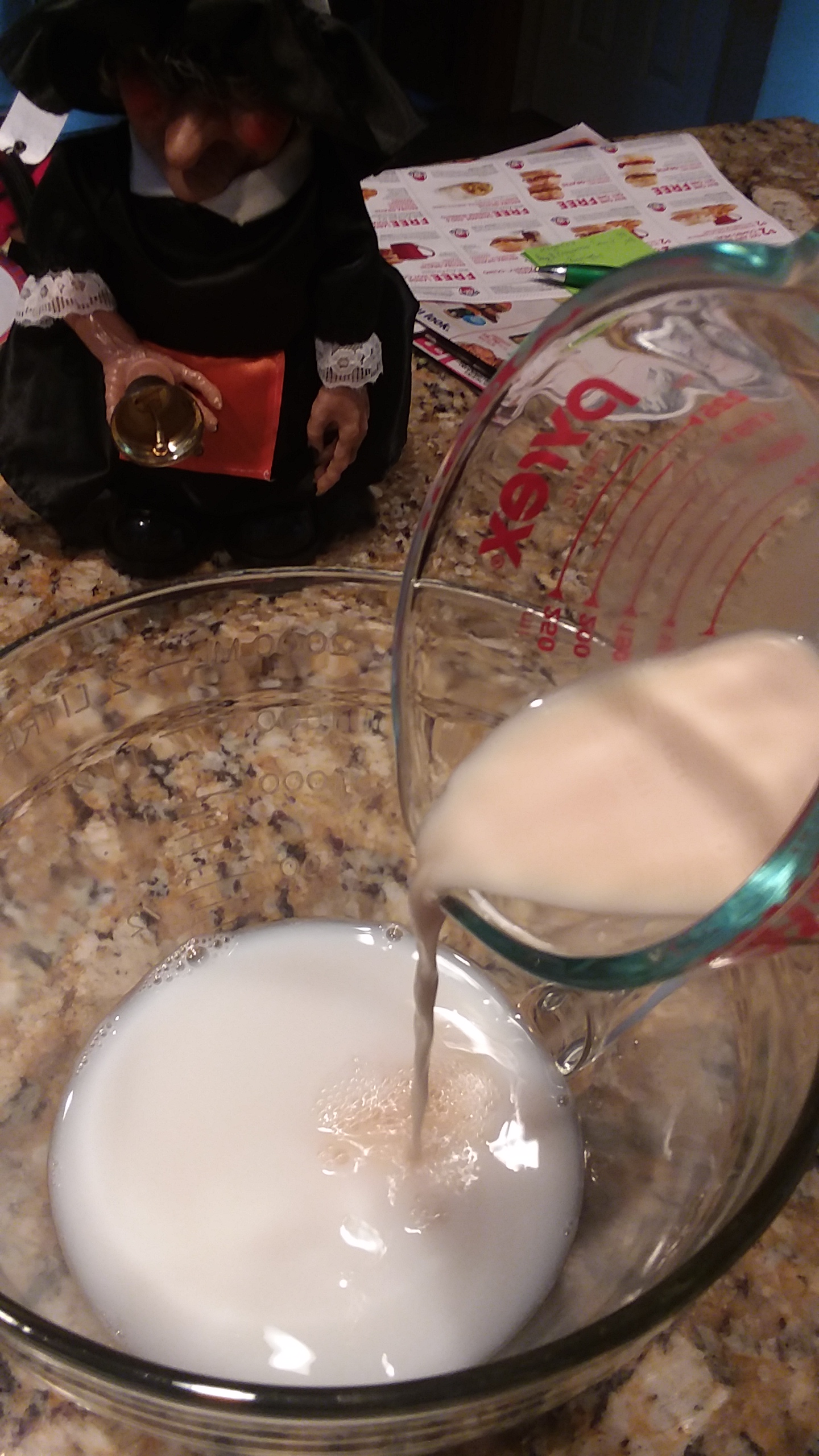 - Add remaining cup of water, milk, sugar, and melted butter and swirl to dissolve sugar