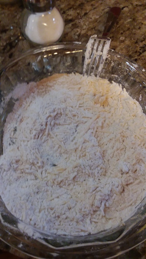 - Season the chicken with salt and pepper, then dredge through the flour and cheese