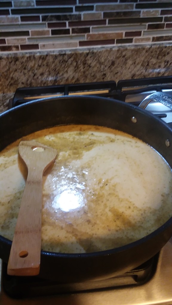 - Reduce heat to low-medium and add the chicken broth and heavy cream