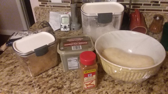 Now, this is my Gramma’s recipe, and as much as I love it, I have found that using Rhodes bread dough works just as well, and you can save time by just thawing out a loaf at a time. I will toss a loaf into a greased bowl, spray some cooking spray on the loaf, and seal the bowl with saran wrap. The bowl can go in the fridge overnight, or on the stove for several hours to thaw out. Once it’s thawed, I take it out of the fridge and place on the counter or stove to start to rise. You want the bread to at least double in size before rolling it out.