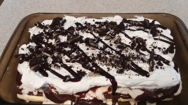 - Decorate the Cool Whip with Hershey’s Syrup, Caramel, Raspberry, etc., then sprinkle with crushed Oreos, sprinkles, etc.