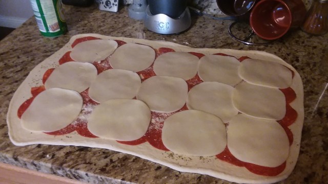 We made these again yesterday for game day, and added a thin layer of sauce and some sausage as well. It was delicious! We heated up the leftover sauce to to dip the slices in, and man, was it delicious!