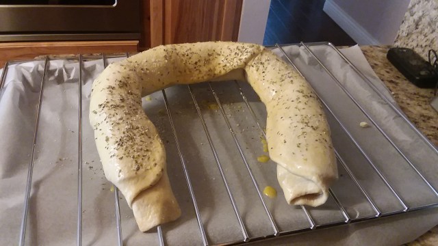 - Make an egg wash and brush it on top of the roll. You can lightly sprinkle your seasoning and parmesan on top if you like.