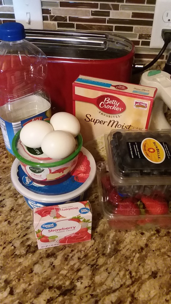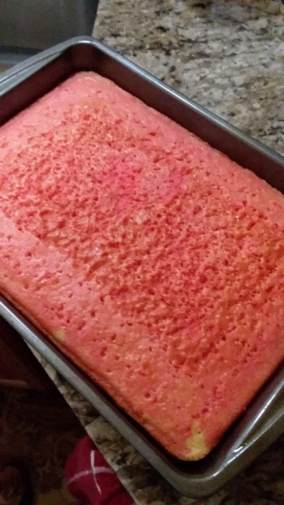 You can change this up, and use chocolate cake or different flavoured jellos, if you really want. My FIL’s sister brought a chocolate-cherry poke cake; she did not put any whipped cream on top, but if she would have, it would have been just like a black forest cake!
